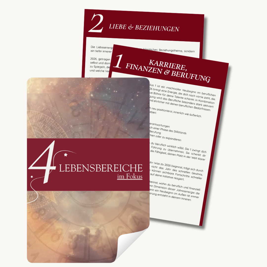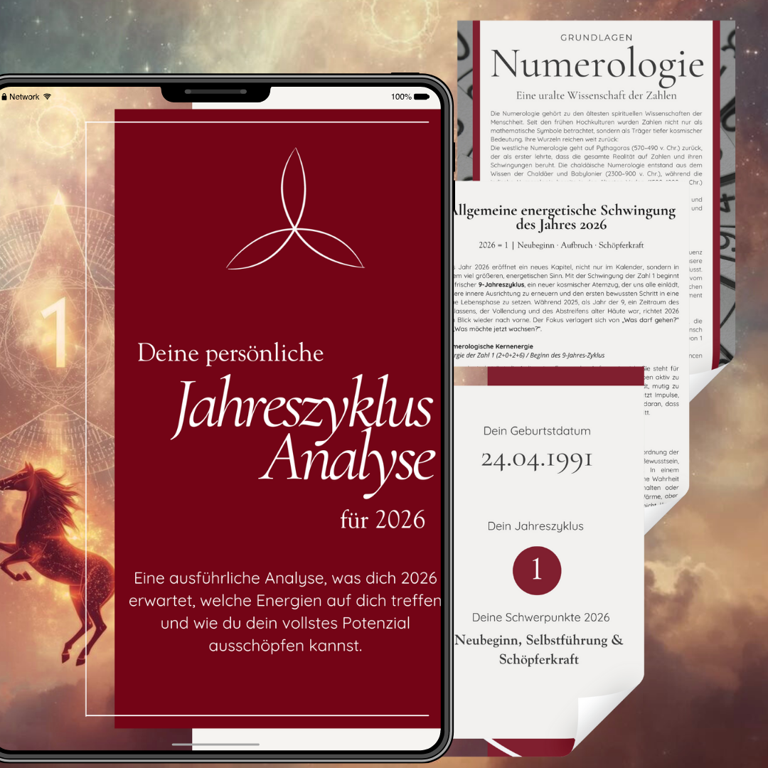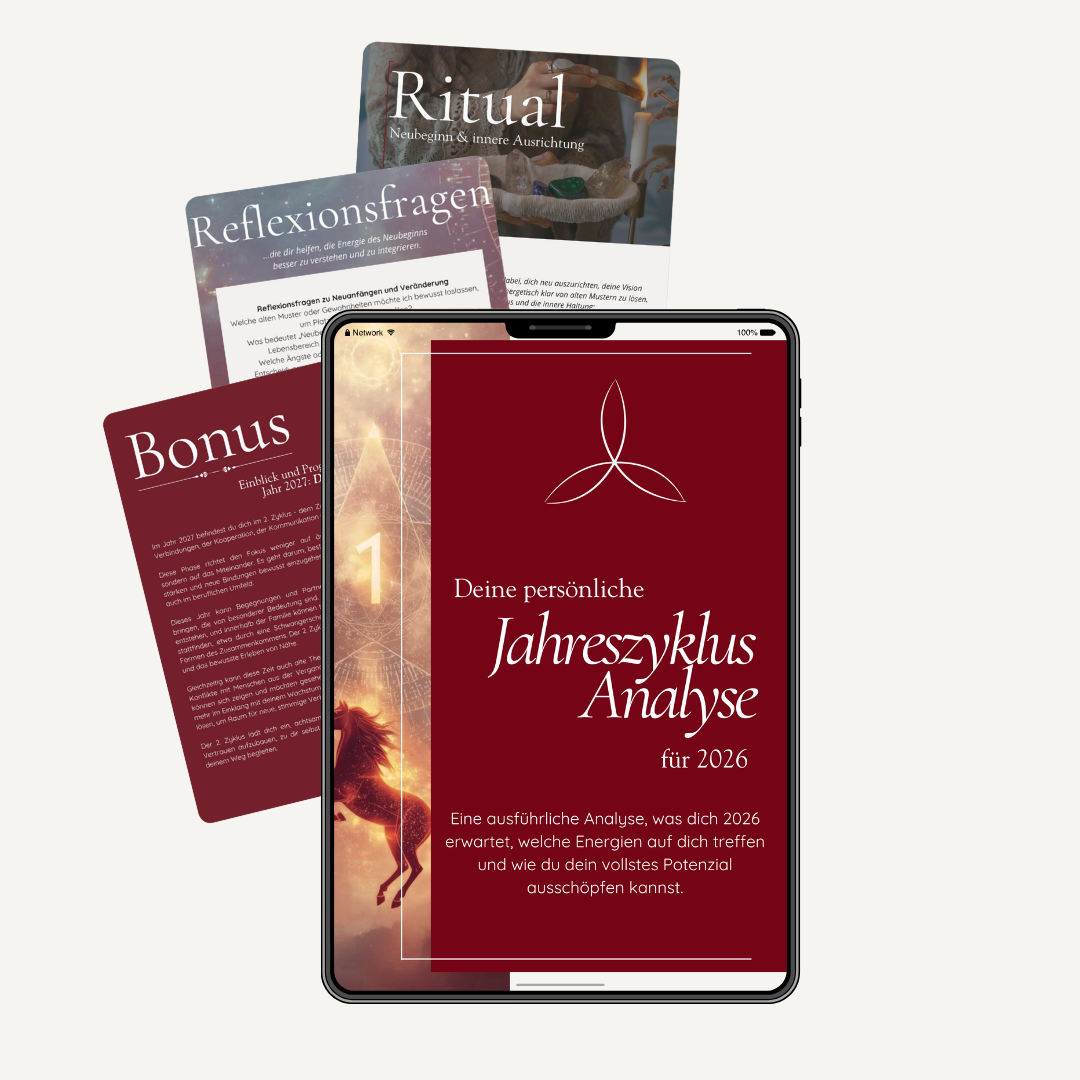 Mit unserer Jahresanalyse wirst du genau das erfahren und deine Energie im Jahr 2026 verstehen und nutzen können. Sie ist dein persönlicher Leitfaden, um Klarheit zu gewinnen, bewusst Entscheidungen zu treffen und dein Potenzial voll zu entfalten.